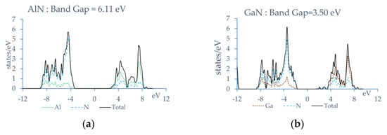 For the reference purpose, total and projected densities of states, henceforth referred to as DOS and PDOS, respectively, were calculated for the single crystalline compounds by including the Hubbard correction for strongly correlated systems implemented in the Quantum Espresso package (DFT+U) [,,]. With Hubbard ortho-atomic parameters U Al-3p = 0.8, N-2p = 8.45, and Ga-3d = 2.5, calculated bandgaps (AlN: 6.11 eV, GaN: 3.50, see below Section 3.6) reproduce satisfactorily the experimental data (AlN: 6.13 eV, GaN: 3.45 eV, [,]). It is worth noting that other pseudopotentials from the Quantum Espresso repository tested in this work yield similar results.
