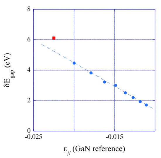 - Gorczyca, I.; Skrobas, K.; Suski, T.; Christensen, N.E.; Svane, A. Influence of strain and internal electric fields on band gaps in short period nitride based superlattices. Superlattices Microstruct. 2015, 82, 438. [Google Scholar] [CrossRef]