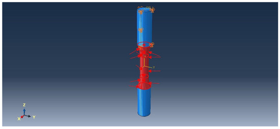 Simulations set up multipoint continuous impacts, similar to the actual machining mode, with each impact point spaced 5000 ns apart for dynamic stabilization time to achieve stabilization at each impact point, while precluding mutual interference between each impact point. A 50% overlap rate was achieved between impact points to ensure the strengthening effect, and the strengthening path is shown in Figure 7. The impact points were 5 in each column, with a longitudinal overlap in the circumference and a spot diameter of 2 mm, and the peak pressure was the control variable, uniformly strengthening for one week.