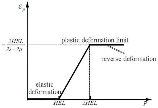 As shown in Figure 6, when , there is only elastic deformation; when < P < 2, plastic deformation occurs, accompanied by elastic recovery, which increases linearly with the impact peak pressure P; when 2< P < 2.5, plastic deformation is saturated, reaching and maintaining a maximum of −2/(3 + 2); when P > 2.5, the residual compressive stress on the metal surface is somewhat reduced due to the surface unloading wave. Therefore, the theoretical optimal peak pressure for laser shock peening should be taken as P = 2~2.5.