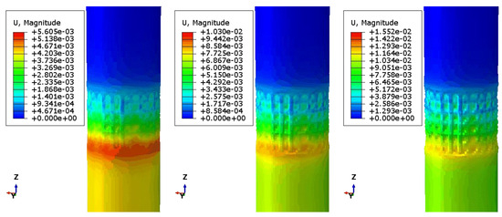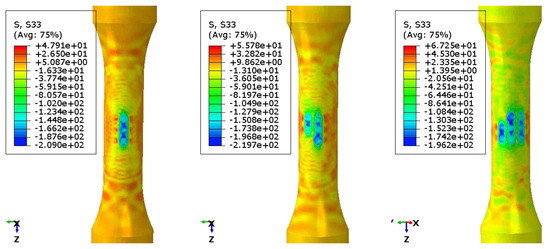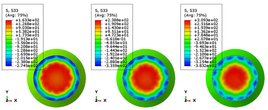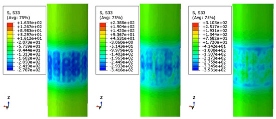 According to the previous calculation, the theoretically most-suitable peak impact pressure is controlled between 2539 MPa and 3173 MPa. If a smaller pressure is selected to convert it into laser parameters, this parameter exceeds the lower limit of the experimental equipment parameters. If the difference in peak pressure selection is too small, it is difficult to compare the enhancement effect. Therefore, peak pressures of 3000 MPa, 4000 MPa, and 5000 MPa were selected for analysis and calculation in this section to verify the theoretical calculation parameters. The simulation results from left to right peak pressures of 3000 MPa, 4000 MPa, and 5000 MPa, respectively, are as follows: