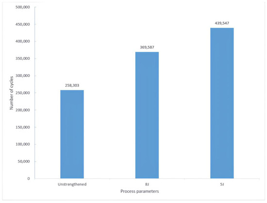 The experimental data are shown in Table 4. The experimental final load of 498 MPa was determined by the first eight failures, and the average number of load cycles of the unprocessed original was 258,303 under the same load, while the number of load cycles was significantly increased after LSP, with an average of 369,587 cycles under the 8J process and an average of 439,547 cycles under the 5J process, which is about 1.7-times higher compared to the original fatigue. The 3J and 2 mm processes had the greatest improvement in fatigue performance due to the minimization of the internal tensile stress in the specimen and the smaller influence of the surface morphology, and the number of rotational cycles passed 107 times. The average data under different parameters are shown in Figure 13.
