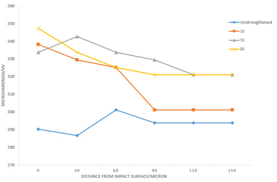 - Laser shock peening can effectively improve the microhardness of the 1Cr18Ni9Ti’s surface, but its strengthening effect weakens with increasing depth. The maximum microhardness can be increased by 19.3% under the 8J process, 17.7% under the 5J process, and 16.2% under the 3J process. The increase in hardness also indicates an increase in fatigue strength.