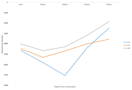Residual stress on the surface of the material has an important impact on the material’s properties, residual compressive stress can inhibit the generation and expansion of cracks on the surface of the material [28,29]. Residual compressive stress will decrease with depth [30]. The results of the laser impact strengthening of the 1Cr18Ni9Ti stainless steel surface’s X-direction residual stress are shown in Table 5; the results show that the data obtained under the 3J parameter is the best. The experimental data line chart is shown in Figure 15.