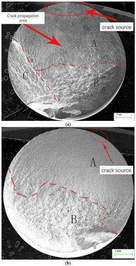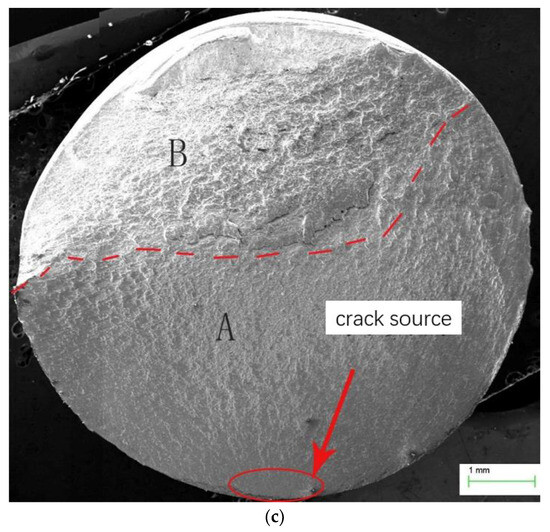 The fracture morphology is shown in Figure 16. The original section can be divided into three areas, A, B, and C. Area A is a relatively straight area of about 1/2 of the section; the cross-section shows that the crack originated from the elliptical marked part of region A, so region A is the crack source area, while region B has a rough and ductile morphology, which is a fatigue transient zone.