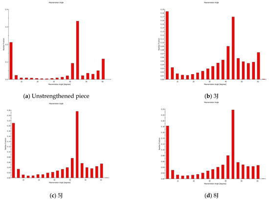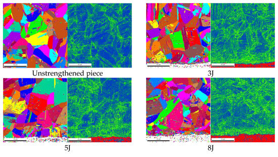 From the size–angle distribution diagram, it can be seen that, after the material undergoes stress deformation, a large number of dislocations are accumulated in the interior, and with the increase of the dislocation density, subcrystalline boundaries are formed inside the material, which further constitutes to the subcrystals. When the stress accumulates to a certain critical value, the subcrystalline boundaries will continue to absorb dislocations, resulting in dynamic recrystallization, and gradually be transformed into large-angle grain boundaries. Therefore, a large number of dislocations exist within the deformed grain, and these dislocations form general deformed grain boundaries with an orientation difference of no more than 2° on both sides, while the angle of the subcrystalline boundaries is generally between 2 and 15° and the angle of the large-angle grain boundaries is more than 15°. From Figure 19a, it can be seen that the proportion of subgrain boundaries with an orientation difference of 2–15° on both sides of the grain boundary on the surface of the raw material is 24.8%. From Figure 19b, it can be seen that the proportion of subgrain boundaries with an orientation difference of 2–15° on both sides of the grain boundary on the surface of the material processed under the 3J parameter is 26.7%. From Figure 19c, it can be seen that the proportion of subgrain boundaries with an orientation difference of 2–15° on both sides of the grain boundary on the surface of the material processed under the 5J parameter is 23.3%. From Figure 19d, it can be seen that the proportion of subgrain boundaries with an orientation difference of 2–15° on both sides of the grain boundary on the surface of the material processed under the 8J parameter is 23.5%. This indicates that the material increases the number of high-density dislocations under the 3J and 5J parameters, while the effect of increasing dislocations under the 8J parameter is poor. This is due to the excessive impact pressure causing the internal plastic wave to rebound and generate tensile stress in the material, resulting in weaker grain refinement and a decrease in the shear dislocation area.