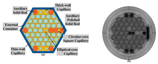Figure 2a illustrates the 2D schematic of the proposed fiber sensor in the process of fabrication. For the proposed structure, it can be practically realized with the well-known stack-and-draw fabrication technique [25]. In manufacturing procedures, an external container is applied to gather a variety of different rods and capillaries at the start-up stage. In the correspondence, thick-wall, thin-wall, elliptical-core and square circular-core fiber capillaries are utilized as basic units to form initial holes, large holes, elliptical core and tiny air hole, respectively. Some simple auxiliary solid rods and two little-bit-complicated auxiliary polished solid rods are applied as the removed air holes in order to fix the position inside the container and create core region area A during the assembly process. An elliptical-core capillary is used to create the elliptical hole on the left side of area A. In addition, a special circular-core square capillary is embedded in these two auxiliary polished solid rods in order to form the tiny air hole and fix its position in the fabrication process. After gathering these rods and capillaries together in a symmetry-shaped hexagonal external container, liquid silica is infiltrated into the space among these micro structures. At this moment, the start-up hexagonal structure is made. The structure is then embedded into a hollow cylinder external container and filled with liquid silica once again to form a cylinder-shaped fiber structure. Then, the structure is shaped into a polished D-shape fiber, and plasmonic metal material, namely nano-scale gold, is coated onto the flattened surface. Subsequently, the final structure of the proposed design is fully realized.