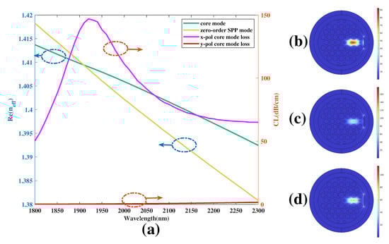 (a) curve of coupled mode in both x- and y-polarization along with the real part of effective RI of coupled mode from core modes and SPP mode with RI selected as 1.28. (b–d) The mode field distributions of coupled mode in x-polarization when wavelength is selected as 1760, 1920, and 2300 nm, respectively.