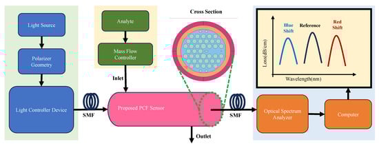 Figure 4 presents a possible implementation of the experimental setup of the SPR sensor for detecting analyte RI. Initially, a broadband light source is employed to direct initial light through a polarizer. In this work, the light exits the polarizer as x-polarized light. Subsequently, the light passes through the light controller device and enters a single-mode fiber (SMF). The SMF is capable of receiving light and transitioning it into an environment suitable for PCF. Molecules in the liquid analyte are utilized for measurement and sensing. These molecules pass through a mass flow controller, serving as the inlet to enter the sensor, and then as the outlet to flow out of the sensor. These interactions lead to the SPR effect and cause a red or blue shift in the loss curve, which can be observed using an optical spectrum analyzer (OSA). The relevant data can be visualized via a computer [38].