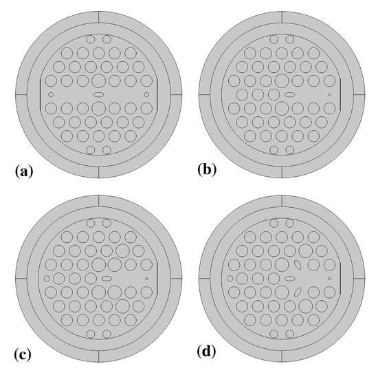 Figure 5 shows the comparison of four 2D schematics of the design. In Figure 5a, a symmetrical construction design is applied to form a dual-core sensor structure with an elliptical core set at the central location to isolate these two core areas. Figure 5b is the initial design. In Figure 5c, a small air hole is added on the left side of the air hole array to concentrate the mode field distribution on core region area A. In Figure 5d, two circular air holes are replaced with elliptical air holes pointing to the core area in order to alter the region for the SPR effect and change the sensing performance.