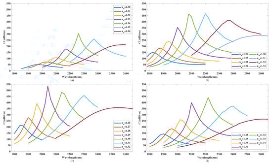 In Figure 7d, with an increase in the sequence of RI within a variation range from 1.28 to 1.33, the curve of the coupled mode in the core area in x-polarization witnesses a significant red-shift. The value has a changing sequence: 1980, 2040, 2100, 2220, 2400, 2500 nm, with RI respectively chosen as 1.28, 1.29, 1.30, 1.31, 1.32, 1.33. According to calculations using Equation (5), the corresponding absolute values of are obtained as 86.39, 107, 147, 130.6, 73.49, and 15.25 , respectively.