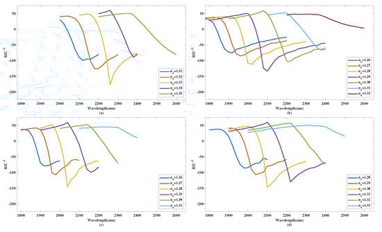 Also, amplitude sensitivity, which is denoted as or , is introduced as a another useful metric. It can reflect the relationship between the curve intensity of the spectra along with the variation sequence of RI. It is defined as Equation (5), the equation below,