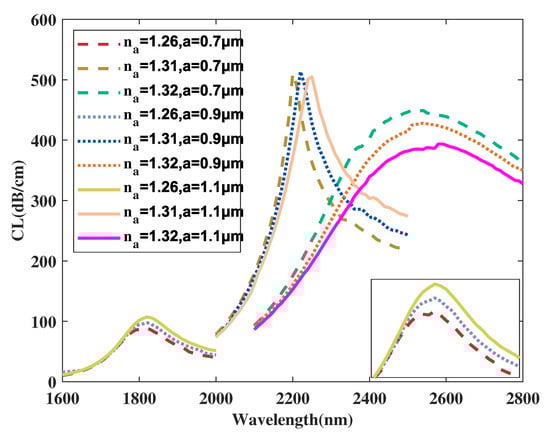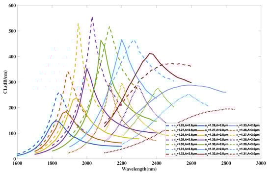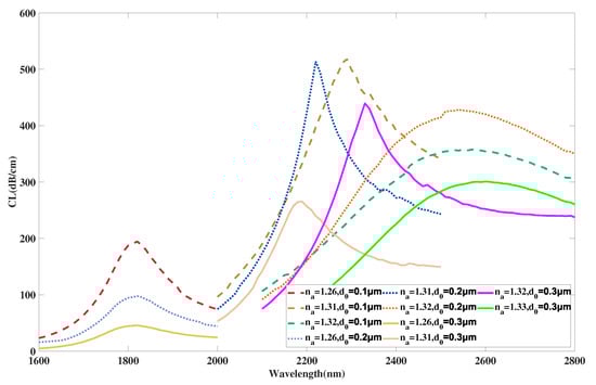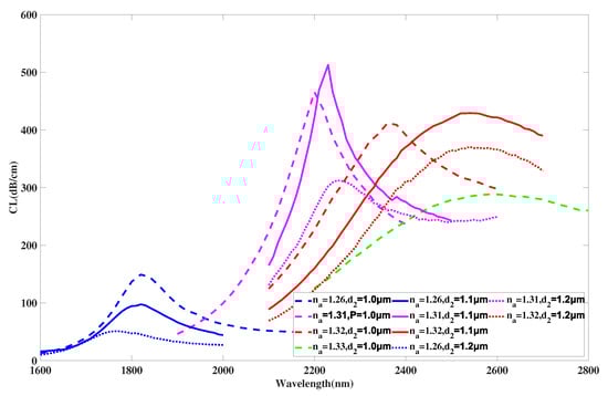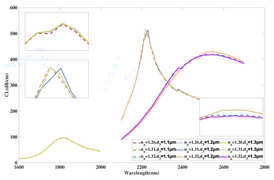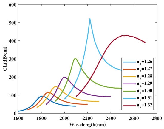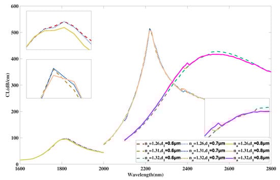 Figure 11 illustrates the curve of the coupled mode in x-polarization when is selected as 0.6, 0.7, 0.8 m, and RI is chosen as 1.26, 1.31, 1.32. From Figure 11, with a rising value of from 0.6 to 0.8 m, the curves with all chosen RI values almost stay still. The intensity of the curve when RI is selected as 1.26 has a subtle decrease. The curve intensity when RI is selected as 1.32 first increases and then decreases. In addition, with increasing, the envelope of curves associated with varying RI become wider and the curve intensity decreases with minor changes. Reasonable explanations for these changes are considered to be that when the value of becomes larger, core area A does not change, but the mode field distributions are altered by the solid-silica area between the air hole array and the exterior analyte. However, variation of values has little effect due to the limited range of variation in fabrication along with the far distance between -radius air holes and the core area, which causes a very small shift of the peak and curve. Moreover, the changes have little effect on the phase-matching condition of the x-polarized coupled mode of area A and further causes the curve and peak to show a slight shift. According to calculation in Equation (4), the maximum values of are achieved as 32,200, 31,500, 30,000 nm/RIU when is selected as 0.6, 0.7, 0.8 m, respectively. It is obvious from the calculation results that the maximum value of the proposed structure gradually drops when has a variation sequence from 0.6 to 0.8 m. Moreover, the average values achieved are 12,000, 12,000, 11,067 nm/RIU when is selected as 0.6, 0.7, 0.8 m, respectively. In this work, efforts are made to ensure most of the energy is concentrated in core area in order to further improve performances. Taking these issues, especially sensing sensitivities, into consideration, the value of is finally set as 0.6 m when the proposed sensor structure reaches an optimal sensing performance.