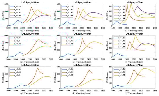 Figure 12 demonstrates the curve of the coupled mode in x-polarization when L is selected as 5.2, 5.6, 6.0 m, t is chosen as 50, 60, 70 nm, and there is a variation of RI from 1.26 to 1.34. From Figure 12, with an increasing value of L from 5.2 to 6.0 m, sensing coverage of RI is gradually narrowed. As seen in Figure 12a,d,g,b,e,h, sensing scope is from 1.26 to 1.33 when L is set as 5.2 m. When L is set as 5.6 and 6.0 m, the proposed sensor structure achieves a narrowed sensing scope from 1.26 to 1.32. As seen in Figure 12c,f,i, sensing scope is from 1.26 to 1.34 when L is set as 5.2 m. When L is set as 5.6 m, the proposed sensor structure achieves a narrowed sensing coverage from 1.26 to 1.33. When L is set as 6.0 m, the sensing scope of proposed sensor structure is further narrowed from 1.26 to 1.32. Reasons for these changes are considered that when value of L becomes larger, the amount of coating increases and area A is significantly compressed. Thus the intensity of the envelope demonstrates a trend from increase to decrease. Also, the increasing value of t changes the amount of Au coating too. Moreover, the variation of L influences mode field distribution at the right side of area A in proposed sensor structure, which has an effect on the phase-matching condition of the coupled mode of area A in x-polarization and causes the curve and peak to demonstrate a visible change. According to calculation in Equation (4), the maximum values of are achieved as 18,500, 29,000, 21,000, 22,000, 32,000, 25,000, 26,000, 18,000, 31,000 nm/RIU for scenarios in Figure 12a–i, respectively. Moreover, the average values achieved are 10,642, 10,714, 10,125, 12,500, 12,000, 10,857, 14,600, 12,833, 12,667 nm/RIU for scenarios in Figure 12a–i, respectively. When the maximum value is given priority to be taken into consideration, values of L and t are set as 5.6 m and 60 nm when the proposed sensor structure achieves an optimal sensing performance.
