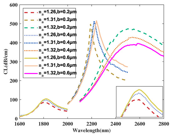 Figure 15 demonstrates the curve of the coupled mode in x-polarization when b is set as 0.2, 0.4, 0.6 m, a is fixed at 0.9 m, and RI is chosen as 1.26, 1.31, 1.32. From Figure 15, when b increases from 0.2 to 0.6 m when a is fixed at 0.9 m, the curve starts to red-shift and the related curve intensity demonstrates a slight increase when RI has a variation sequence from 1.26 to 1.31. Also, when RI changes from 1.31 to 1.32, the curve of this design has a significant red-shift and the intensity decreases. In addition, with an increasing value of b, the envelope of curves associated with varying RI values demonstrates a red shift and becomes broader. The reason for these changes are considered to be that when value of b becomes larger, core region area A is vertically compressed to a certain degree, influencing the mode field distributions. This also alters the phase-matching condition of the x-polarized coupled mode of area A and further causes the slight shift in the curve and peak. Meanwhile, the change of the core area in the vertical direction has little influence on the concentration of the energy. Thus, the change of envelope intensity is small. According to calculation in Equation (4), maximum values are achieved as 31,000, 32,000, 31,000 nm/RIU when b is chosen as 0.2, 0.4, 0.6 m, respectively. It is clear from the calculation results that the maximum value of in the proposed design illustrates a trend from rise to decline with a variation of b from 0.2 to 0.6 m. Additionally, the calculated average value of the proposed structure increases with b changing from 0.2 to 0.6 m. Moreover, the average values achieved are 11,333, 12,000, 12,167 nm/RIU when b is chosen as 0.2, 0.4, 0.6 m, respectively. When maximum value is considered a priority, the value of b is finally chosen as 0.4 m when the proposed sensor structure achieves an optimal sensing performance.