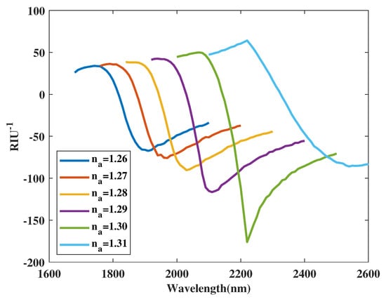 Figure 17 illustrates curves of coupled modes in x-polarization corresponding to changing RI values from 1.26 to 1.31. With an increasing RI value from 1.26 to 1.31, curves of coupled modes in x-polarization experience a significant red-shift. , representing the wavelength at which the maximum absolute value of the negative semi-axis in the curve occurs, follows the sequence: 1910, 1970, 2030, 2110, 2220, 2540 nm with RI varying as 1.26, 1.27, 1.28, 1.29, 1.30, 1.31. From Figure 17 and Equation (5), the maximum absolute value of for all curves is obtained as 67.35, 75.83, 90.36, 116.5, 176, and 85.92 RIU, respectively.