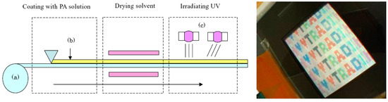 - Sonehara, A.; Maruyama, K.; Ono, Y.; Sugizaki, A.; Eguchi, T.; Suzuki, Y.; Ito, T.; Kumano, A.; Takahashi, T. Continuous Coating of Photo-Alignment Layer on a Flexible Color Filter for LCDs Using a Roll-to-Roll Manufacturing Process. SID Symp. Dig. Tech. Pap. 2006, 37, 1579–1582. [Google Scholar] [CrossRef]