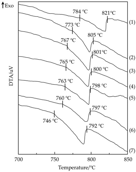Solidus and liquidus temperatures of the Ag10CuZnSn-xIn-yCe low-silver filler metals: (1) Ag10CuZnSn; (2) Ag10CuZnSn-1In-0.05Ce; (3) Ag10CuZnSn-1.5In-0.05Ce; (4) Ag10CuZnSn-1.5In-0.15Ce; (5) Ag10CuZnSn-1.5In-0.3Ce; (6) Ag10CuZnSn-1.5In-0.5Ce; (7) Ag10CuZnSn-3In-0.5Ce.