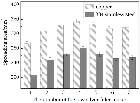 Spreading areas of the Ag10CuZnSn-xIn-yCe low-silver filler metals on the Cu plates and the 304 stainless steel plates.