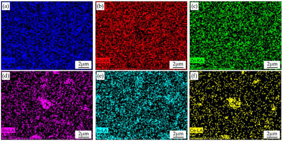 As the point analysis results of a particle are affected by the surrounding elements, EDS mapping was conducted in Figure 3i, and Figure 4 shows the element distribution of Ag10CuZnSn-3In-0.5Ce alloy shown in Figure 3i. It can be clearly seen that the distributions of Sn and Ce overlap with the white phase, and the contents of the other elements in the white phase are low. According to the point analysis result of point E in Figure 3i and the Sn-Ce phase diagram and composition of point E in Figure 3, it is predicted that the Sn-Ce phase should be Ce2Sn3. Moreover, the distribution of the In elements overlaps with the gray phase. When the content of In is high (3 wt%), it cannot fully dissolve into the Ag matrix and the Cu matrix. Meanwhile, the In has a much lower melting point; thus, it tends to concentrate at the front of the solid–liquid interface during the crystallization process, and finally solidifies at the grain boundary to form the In-rich phase. Wu et al. [25] found that Cu4In and Ag9In4 IMCs appeared in Ag12CuZnSn-5In brazing filler metal. Therefore, there was a sufficient basis to infer that the In-rich phase in this paper was mixed IMCs of Cu4In and Ag9In4. A more Ce-rich phase precipitated at the grain boundaries during the cooling process. It has been revealed that the presence of the brittle IMC will decrease the mechanical properties of the filler metal and the brazed joints [26]. Since the Ce2Sn3, Cu4In, and Ag9In4 IMCs are brittle, the additional amount of In and Ce should be controlled, especially the content of Ce.