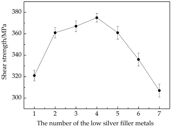 To further reveal the effects of the composite alloying of In and Ce on the mechanical properties of the Ag10CuZnSn brazed joints, the 304 stainless steel plates were lap brazed with the seven low-silver filler metals, and the shear strength of each group of brazed joints was tested. The results show that fractures of all the samples occurred in the brazing seams, and the shear strength is shown in Figure 5. The addition of In and Ce significantly improves the shear strength of the 304 stainless steel brazed joints. One reason is that the In can be dissolved into the Ag-rich and Cu-rich phases and thus strengthen the filler metal. Moreover, comparing the joints brazed with the No. 3 to No. 6 filler metals, it can be found that when the In content is constant, the shear strength increases with the increasing Ce content. When the contents of the In and Ce are 1.5 wt% and 0.15 wt%, respectively, the shear strength reaches a maximum value of 375 MPa, because the Ce can aggregate at the grain boundaries and refine the microstructure of the filler metal, and thereby improve the shear strength of the brazed joints. In general, the shear strength of the brazed joints is improved due to fine grain strengthening of the Ce element and solution strengthening of the In element. However, when the content of Ce is higher, the shear strength begins to decrease and is even lower than the joints brazed with Ag10CuZnSn.