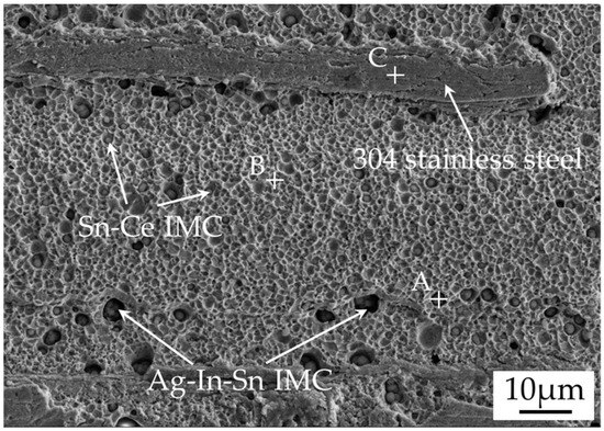 Figure 6 shows the microstructure and elements distribution in the 304 stainless steel/Ag10CuZnSn-3In-0.5Ce/304 stainless steel brazing seam, in which the Ag, In, and Sn elements overlap with the gray phase, and the Sn and Ce elements overlap with the bulk white phase. Thus, it is inferred that there are strips or blocks like In-rich IMC and bulk Sn-Ce IMC in seam. The corresponding fracture morphology of a brazed joint is shown in Figure 7, and combined with the EDS results shown in Table 4, it can be concluded that the A region was composed of the Cu4In and Ag9In4 IMCs and the B region was composed of the Ce2Sn3 IMC. As the IMCs are brittle, they can easily crack under stress, which decreases the shear strength of the joint [27]. According to the microstructure and shear strength, it is concluded that the optimal addition amounts of the In and Ce in the Ag10CuZnSn-xIn-yCe filler metal are 1.5 wt% and 0.15 wt%, respectively.