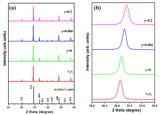 XRPD patterns of the Y2−x−yO3:Hox=0.005, Yby phosphors are shown in Figure 1. The XRPD patterns agree with the standard reflection peaks reported in JCPDS# 71-0099 [25], and indicate the cubic structure with an Ia space group of the Y2O3 crystal. The XRPD patterns of the Y2−x−yO3:Hox=0.005, Yby phosphors are shown in Figure 1. The introduction of Ho3+ and Yb3+ ions as co-dopants into Y2O3 did not change the structure type, but a small shift towards high angles in the diffraction reflection peaks was observed with increasing Yb concentration (Figure 1b). The shift is attributed to the ionic radius difference between the Yb3+ (0.868 Å) and Y3+ (0.900 Å) ions. Also, the peak shift verifies that Yb3+ are effectively incorporated into the Y3+ site [15].