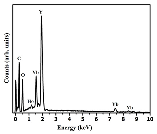 The morphologies and elemental analyses of the prepared samples were studied using SEM and EDS, respectively. Figure 2 displays the SEM images of the prepared phosphors. All the images exhibited agglomerated spherical nanoparticles. The addition of Ho3+, Yb3+ did not change the morphology of the Y2O3 host. The EDS spectra of the Y2−x−yO3:Hox=0.005, Yby=0.2 are displayed in Figure 3. All the Y, O, Yb, and Ho elements expected in the sample were observed, which confirms the successful incorporation of Ho3+ and Yb3+ into the Y2O3 host. In addition, carbon was also detected in the spectrum, which could be from the carbon tape used when mounting the samples. The extra peak detected around 0.03 keV is due to electronic noise within the system. No impurities were detected in the spectra, which agrees with the XRD results.