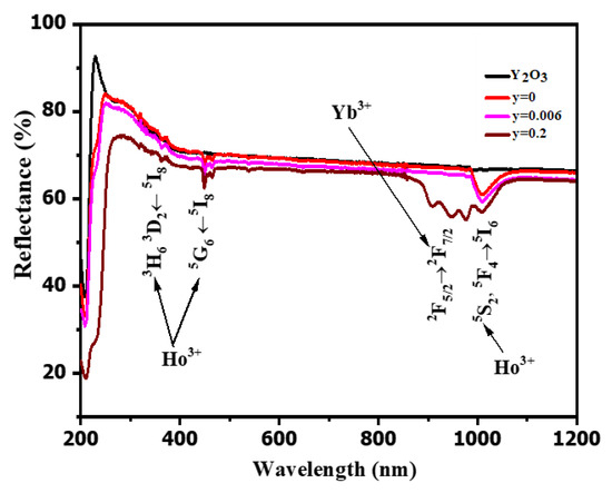 Diffuse reflectance spectra of the Y2−x−yO3:Hox=0.005, Yby UC phosphors.