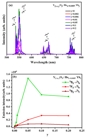 (a) UC emission spectra of Y2−x−yO3: Hox=0.005, Yby powders and (b) green (5S2 → 5I8), red (5F5 → 5I8,), and NIR (5S2 → 5I7) emission intensity peak as a function of y.
