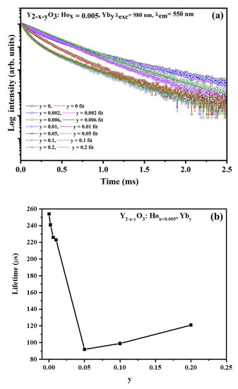 (a) The fitted decay curves of Ho3+, Yb3+ co-doped Y2O3 phosphors for different concentrations of the Yb3+ ions under the 980 nm excitation and (b) lifetime as a function of y.