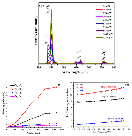 The relation of UC emission intensity to the laser power for the co-doped phosphor was investigated to determine the number of excitation photons needed for each emission photon. Figure 8a represents the emission spectra of Y2−x−yO3:Hox=0.005, Yby=0.05 as a function of the laser power. The UC intensity continuously increased with laser power. The increase in laser power did not affect the peak position but enhanced the UC emission intensity for each of the observed bands (Figure 8b). The UC emission intensity relationship to laser power is modelled using the I α Pn [41] relation, where I, P, and n are the UC emission intensity, pump power, and the number of pump photons involved in the UC emission process, respectively. Figure 8c represents the ln(power) versus ln(intensity). These plots give straight lines with slopes (n values) of 1.69, 1.88, and 1.92 for green (536 and 550 nm) and red (668 nm) emissions, respectively. According to the energy level diagram (see Figure 9), 536 and 550 nm peaks (5F4, 5S2 → 5I8) and 756 nm peak (5S2 → 5I7) result from the same populated levels (5F4, 5S2) of Ho3+, and therefore, they have nearly same slopes. Pandey et al., [16] found n values of 2.28 and 1.91 for the green (550 nm) and red (668 nm) emissions. All the slope values are close to two, indicating the involvement of two NIR photons in all of the emission bands.