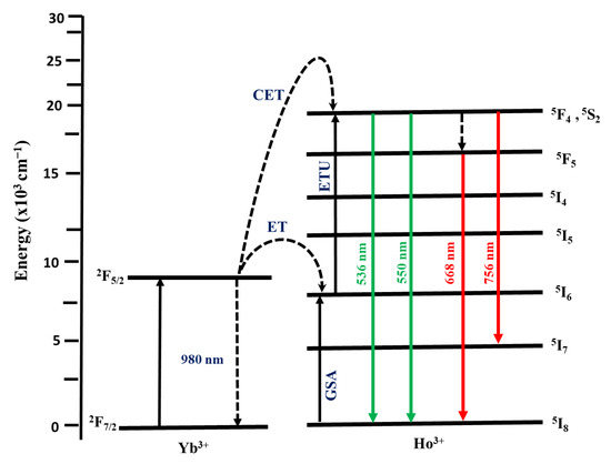 The energy transfer (ET) mechanism of the UC in the Ho3+, Yb3+:Y2O3 powders is illustrated in Figure 9. The Yb3+ ion is excited from the ground state 2F7/2 to the excited state 2F5/2 through the 980 nm excitation. The absorbed energy is then transferred via a non-radiative resonance ET to the nearby Ho3+ ion, exciting an electron from the 5I8 ground state to the 5I6 excited level. The excited ions in the 5I6 level are further excited to the 5S2, 5F4 level of the Ho3+ ion through energy transfer up-conversion (ETU). The populated 5S2, 5F4 levels relax to the 5I8 and 5I7 states radiatively and result in green emissions at 536 and 550 nm through the 5F4 → 5I8, 5S2 → 5I8 transitions, and NIR emission at 756 nm through the 5S2 → 5I7 transitions. Moreover, the relaxation process from the 5S2, 5F4 level may populate the 5F5 level via non-radiative multiphonon relaxation and result in a red emission at 668 nm through the radiative 5F5 → 5I8 transition [42,43]. The UC emission can also take place through cooperative energy transfer (CET) between two Yb3+ ions and one Ho3+ ion. The 5F4, 5S2 excited states of Ho3+ ions are situated twice of that Yb3+:2F5/2 excited state. In this case, two Yb3+ ions can transfer their energy cooperatively to one Ho3+ ion in the ground state in which the Ho3+ ion is promoted to the 5F4 and 5S2 excited states. All these emissions are two-photon processes.