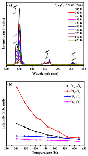 To study the properties of optical temperature sensing of the sample, the temperature-dependent UC was analysed using the FIR technique. Figure 10a shows the temperature-dependent UC spectra of the Y2−x−yO3: Hox=0.005, Yby=0.05 phosphor, with the most intense green emission centred at 550 nm associated with the 5S2 → 5I8 transition of the Ho3+ ion. For all the UC emission bands, no significant shift in wavelength position was observed from room temperature up to 623 K. It is also evident that as the temperature rises, thermal quenching causes all the bands to progressively lose their intensity (Figure 10b).