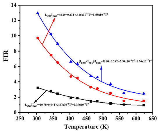 Figure 11 presents the temperature dependence of the I536/I668, I550/I668 and (I536+I550)/I668 FIRs. Non-TCLs are often fitted by empirical functions due to the absence of quality physical models classifying temperature-dependences of the FIR parameters [44]. Therefore, FIR of the bands at 536, 550, and 668 nm can be fitted using the function: