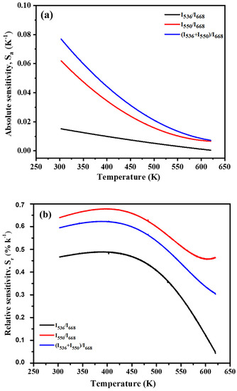 Figure 12a,b shows the absolute and relative sensitivities versus temperature. As the temperature increased, both the absolute sensitivity and the relative sensitivity decreased. All the values reached maxima at 303 K. The maximum SR values were determined to be 0.47 (I536/I668), 0.64 (I550/I668), and 0.59%K−1 ((I536 + I550)/I668), respectively, while the SA values were found to be 0.02 (I536/I668), 0.06 ((I536 + I550)/I668), and 0.08 K−1 ((I550/I668), respectively. The (I536 + I550)/I668 FIR had the largest SA, while I550/I668 had the highest SR values. The 5F5/5F4, 5S2 levels are non-thermally coupled energy levels, and thus, the temperature sensor sensitivity is substantially higher [21].