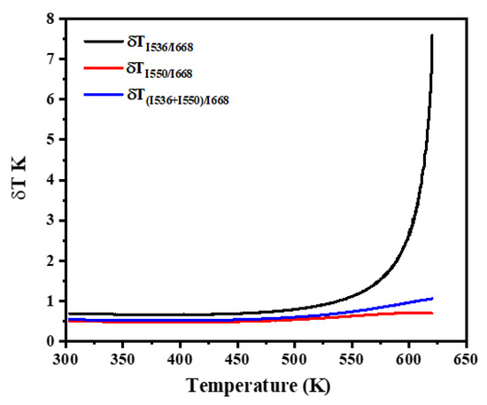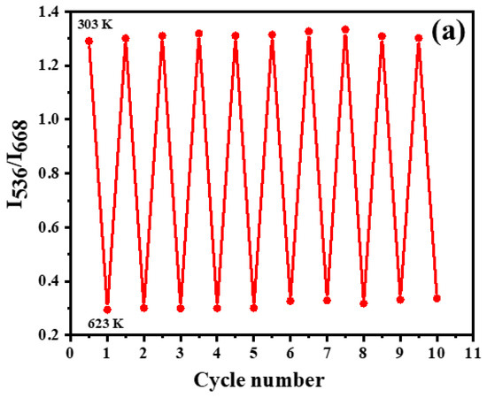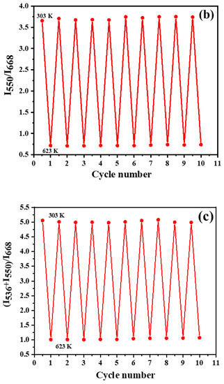 represents the resolution/uncertainty of the FIR value. The temperature uncertainty ( depends on the signal-to-noise ratio of the emission spectra and relative sensitivity (SR) [53]. The best temperature uncertainty determined at 303 K was for I536/I668 FIR, i.e., = 0.71 K. For other FIRs, temperature uncertainty values were determined to be 0.51 K for I550/I668 and 0.57 K for (I536 + I550)/I668 at the same temperature, Figure 13. The temperature uncertainty at this temperature can be used for biological research [54]. As the temperature increased to 623 K, the temperature uncertainty reached maximum values at 7.61, 0.70, and 1.08 K for I536/I668, I550/I668 and (I536 + I550)/I668, respectively. The temperature uncertainty at 623 K results in sufficient optical temperature sensing. Moreover, such temperature uncertainty at high temperature could be potentially used in industrial applications, especially for processes which require high temperature conditions as well as other fields, i.e., submicron-scale resolution [44]. Moreover, stability and repeatability for optical temperature sensing are also important factors. Therefore, several heating-cooling cycling experiments were performed on the Y2−x−yO3:Hox=0.005, Yby=0.05 phosphor to verify the repeatability of the synthesized material, Figure 14a–c. This was achieved by studying the FIR changes in the I536/I668, I550/I668, and (I536 + I550)/I668 at 303 and 623 K, respectively. The deviation percentage of the FIR in the repeatability experiment was found to be 1.19%, 3.49%, and 3.25% for I536/I668, I550/I668, and (I536 + I550)/I668, respectively. After 10 heating-cooling repeated cycles, the FIR values showed no obvious difference and could be reversed and repeated. These results indicate that the FIR based on non-TCLs own good stability, indicating that Y2−x−yO3:Hox=0.005, Yby=0.05 phosphor has good signal reproducibility and is a capable candidate for optical temperature sensing.