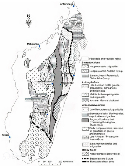 - Paquette, J.L.; Nédélec, A. A new insight into Pan-African tectonics in the East–West Gondwana collision zone by U–Pb zircon dating of granites from central Madagascar. Earth Planet. Sci. Lett. 1998, 155, 45–56. [Google Scholar] [CrossRef]