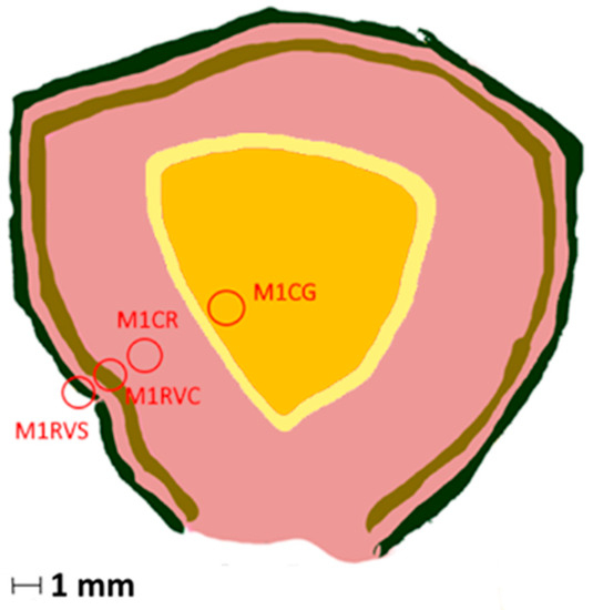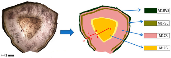 Optical observations of the basal slice (perpendicular to the c axis) show four main pronounced color zones from the rim to the core: a dark green rim (M1RVS); a pale green rim (M1RVC); a pale pink rim (M1CR); and a brownish yellow triangular core (M1CG) (Figure 3). The light yellow zone that surrounds the brownish yellow core indicates the transition between the (M1RVS), (M1RVC) and (M1CR) zones that perpendicularly cross the prismatic growth bands and the (M1CG) core zone that cuts the side of the inner pyramidal growth sectors of the slice.