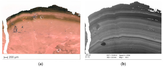 Outer zone of the MADAG1 slice: (a) optical image; (b) VPSEM image showing the complex oscillatory zoning in the pink region.