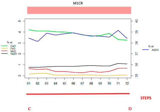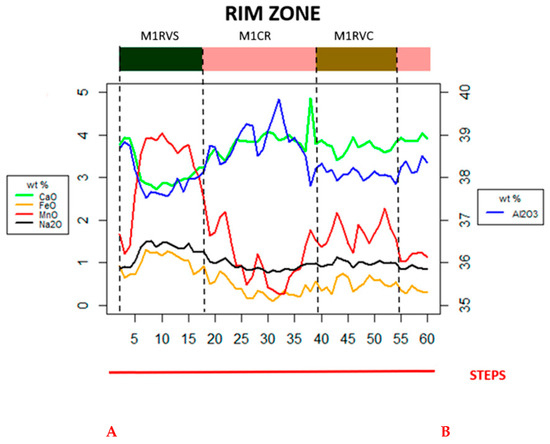 The A-B traverse of the outer zones (M1RVS, M1RVC and M1CR) exhibits an important oscillatory zoning; the dark green rim shows a high content of MnO (up to 4.03 wt %) that at the interface with the pink zone decreases (to 0.25 wt %) then slightly increases in the pale green rim (to 2.28 wt %) (Figure 5). MnO shows a negative correlation with Al2O3 and CaO and a positive correlation with Na2O and FeO. The three rim zones show different FeO content, with the dark green outer rim characterized by a higher amount of FeO (maximum value 1.27 wt %). In the pink rim zone, the FeO content decreases (to 0.10 wt %) and slightly increases in the pale green rim (up to 0.74 wt %).