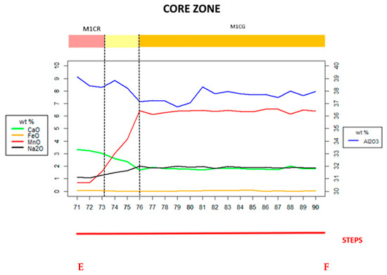 EPMA traverse at the interface between the M1CR and the core zone of slice (length 4230 µm) with 20 analysis points and a step size of 211 µm with the variation in the main elements (oxide wt %). Note the sharp variation in MnO in the light yellow transition zone that surrounds the core.