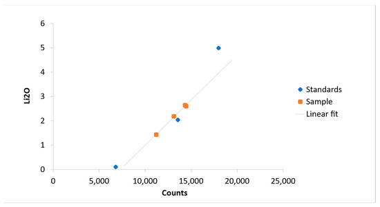 The calibration line obtained by LIBS (Figure 8) plotting the counts of the Li emission line at 670.7 nm acquired from the standard materials versus the Li2O wt % shows an excellent fitting (r2 = 0.94). Thus, the quantification of Li2O was obtained using the equation Li2O% = 0.0004x − 3.0543, where x represents the average of the Li emission line counts at 670.7 nm measured from the sample.