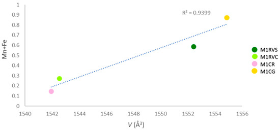 Correlation between the unit cell volume (Å3) and Mn + Fe content (apfu) in the present samples. The blue dashed line represents regression line.