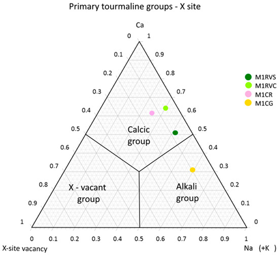 Ternary system for the primary tourmaline groups based on the dominant occupancy of the X site. The colored circles represent the average chemical composition obtained with EPMA and SREF data for each zone (M1RVS, M1RVC, M1CR and M1CG).
