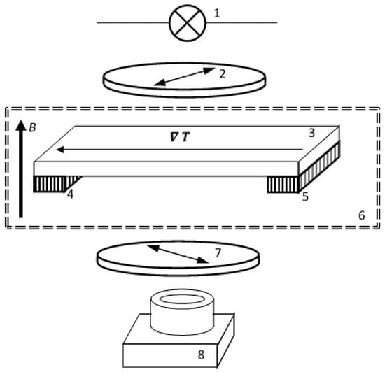 General scheme of the experiment. 1—unpolarized light source, 2—polarizer, 3—film sample, 4—heating Peltier element, 5—cooling Peltier element, 6—temperature-controlled stage, 7—analyzer, and 8—camera and microscope at 550× magnification, B—magnetic field, ∇T—lateral temperature gradient.