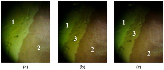 Starting from the first critical value Hc1, the field increase brought the extra features into the observed pattern. A transition region of intermediate brightness appears between regions that represent collinear phases (Figure 3b). The field growth up to the second critical value Hc2 increased the width of the transition region.