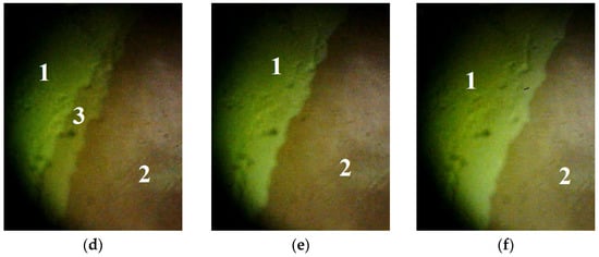 Magneto-optical visualization of phase states in the (BiYLu)3(FeGa)5O12 sample at the temperature T = 327.5 K (the region of magnetic compensation) in an external magnetic field B = 0.5 T (a), B = 1.0 T (b), B = 1.03 T (c), B = 1.05 T (d), B = 1.1 T (e), and B = 1.2 T (f). (1), (2) Collinear phases of opposite magnetization direction; (3) non-collinear (canted) magnetic phase.