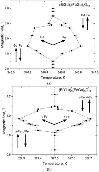 Below the compensation temperature in the second type of sample (Figure 5b) dominated the octahedral magnetization, and it was directed along the magnetic field in the collinear phase. Above the compensation temperature, vice versa, it was dominated by the tetrahedral sublattice. In the canted phase, the deviation from the antiparallel magnetization arrangement was small, in the order of several degrees (our estimations using molecular field theory). A change in temperature primarily changed the angle between the magnetizations and the field, so that the magnetizations remained almost antiparallel to one other. Although the bismuth gadolinium garnet had three magnetic sublattices, the net iron magnetization could be considered as a single one. As a result, we could consider the first type of sample as a ferrimagnet of two magnetic sublattices, where one sublattice was gadolinium, and the other sublattice was iron (Figure 5a).