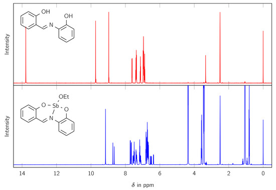 The synthesized complex LSb was studied with various analytical methods. Firstly, 1H and 13C NMR spectra were measured to identify the product and determine its purity. The 1H NMR spectra comparing the free ligand H2L and the complex LSb are shown in Figure 1.